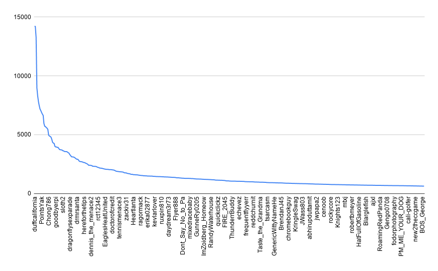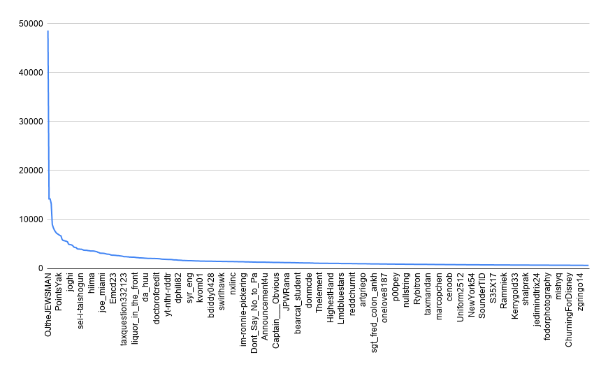 We can also look at the distribution of users that comment. We actually really only have one outlier, u/OJtheJEWSMAN. If we remove that account, our distribution looks like a pretty typical Pareto distribution. This year, OJ has made 14,710 comments, which accounts for roughly 2% of all comments on the subreddit.