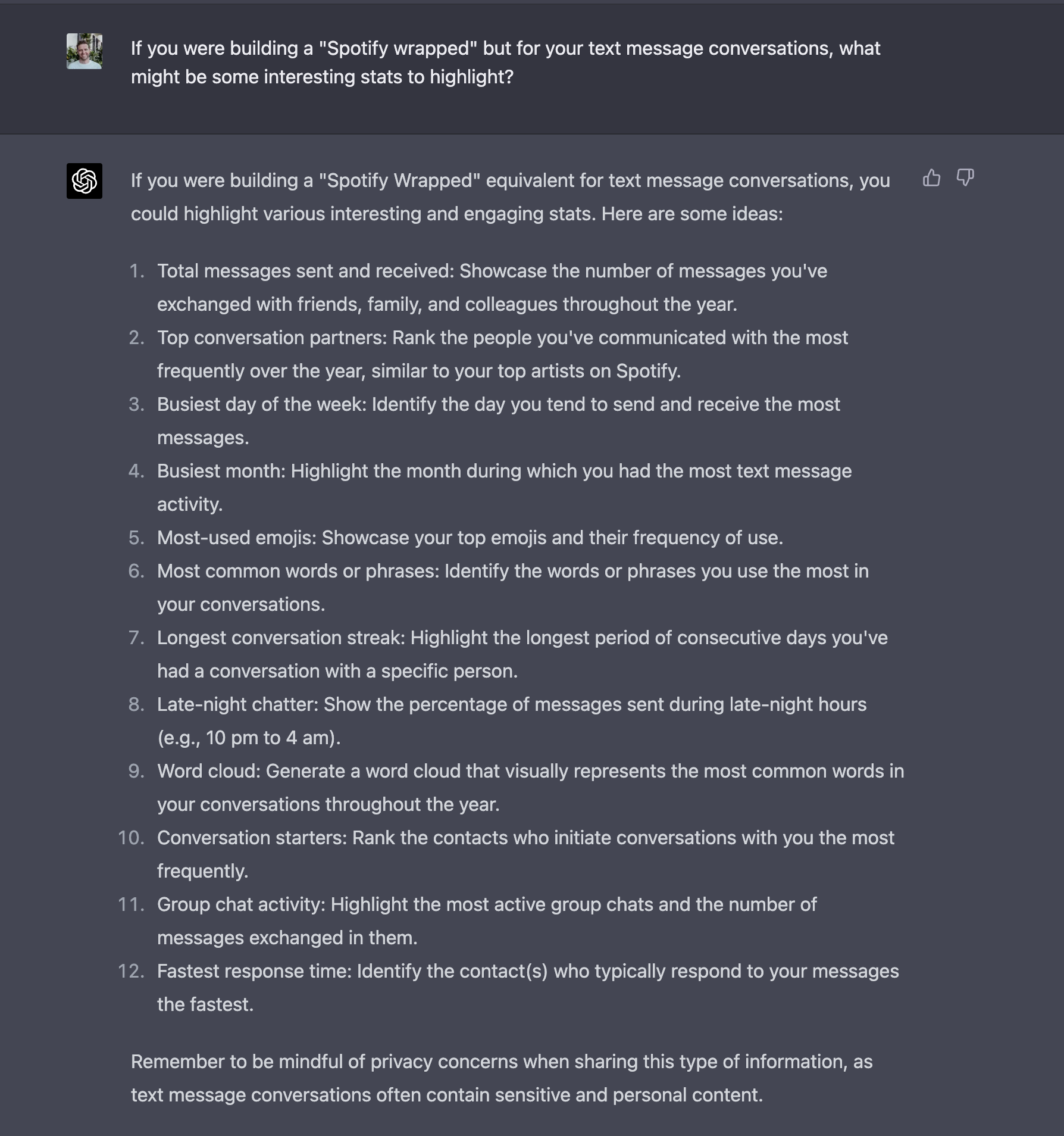 I actually used ChatGPT to generate the product features included in iMessage Wrapped - as soon as it can do figma mocks I'll redesign the UI using that, as well.